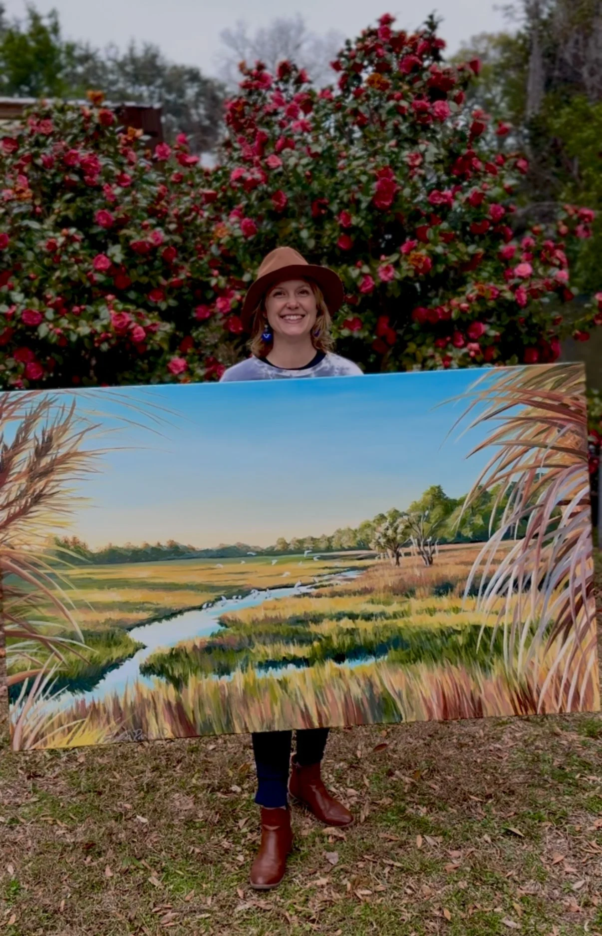 Tessa holds the 36'“x 60” inch painting on canvas in front of her winter blooming camelias.